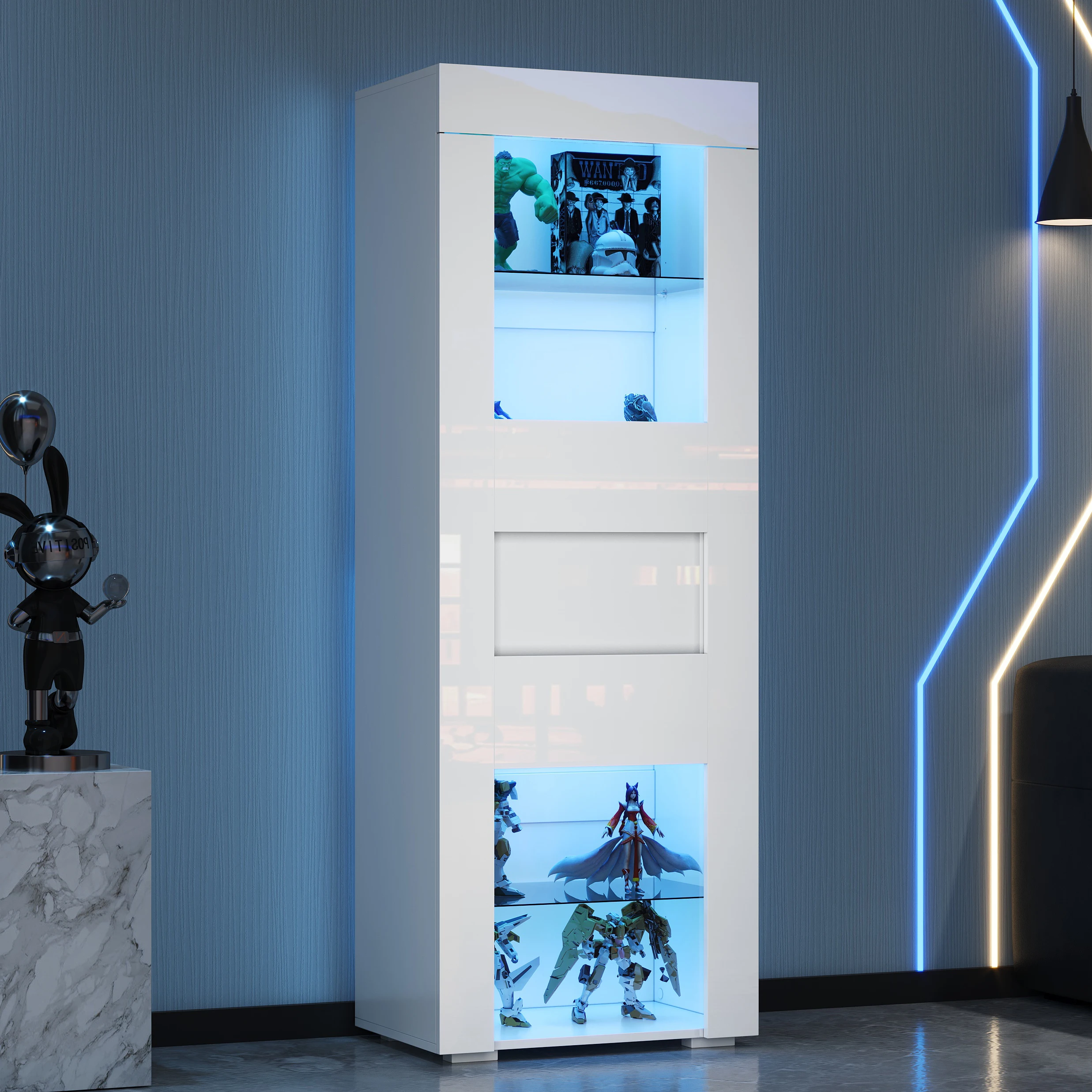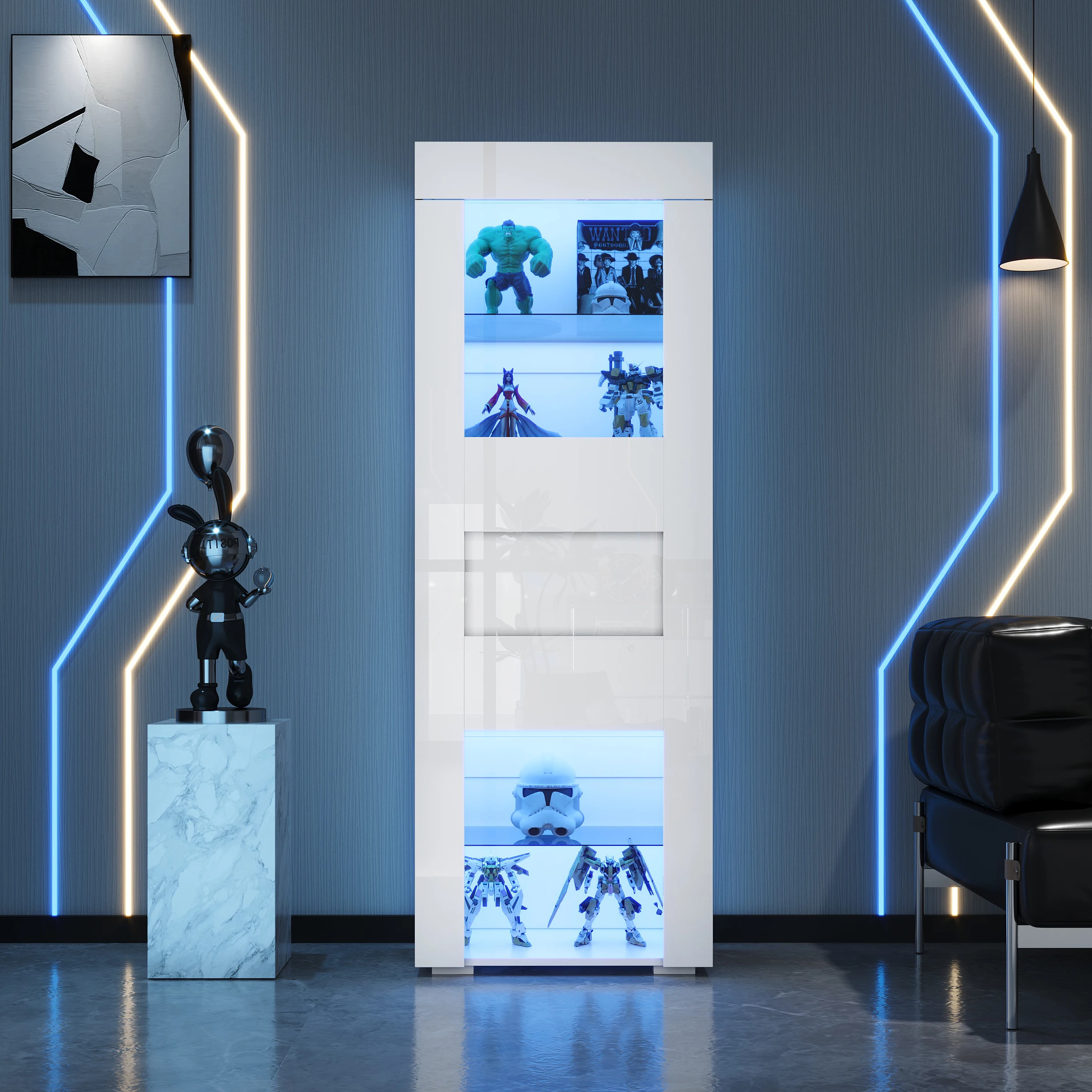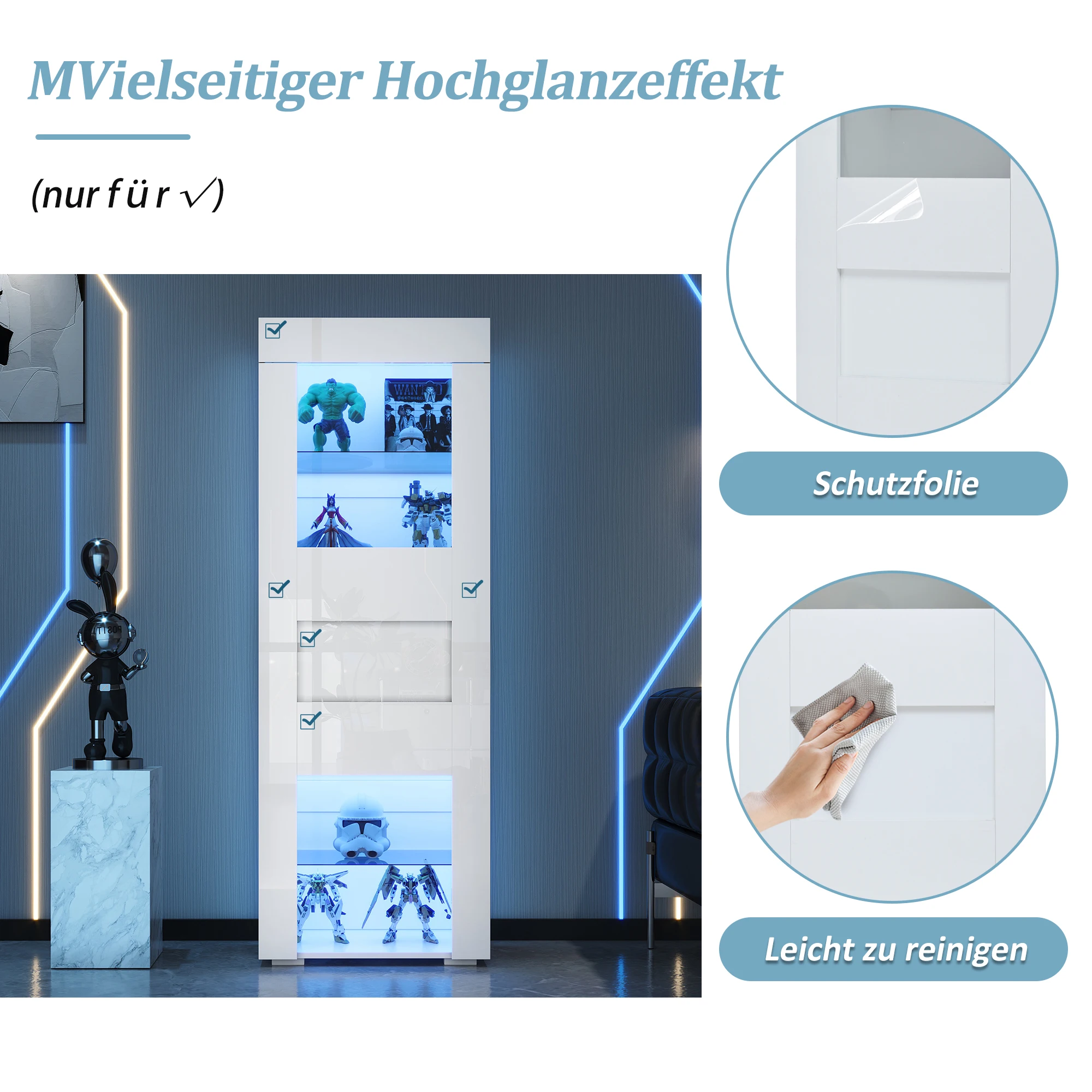 Easy to clean: The high-gloss surface of the front is smooth and delicate, making it incredibly easy to clean. A gentle wipe removes dust and stains, ensuring the display cabinet always looks new. The high-gloss surface is limited to the front of the cabinet.