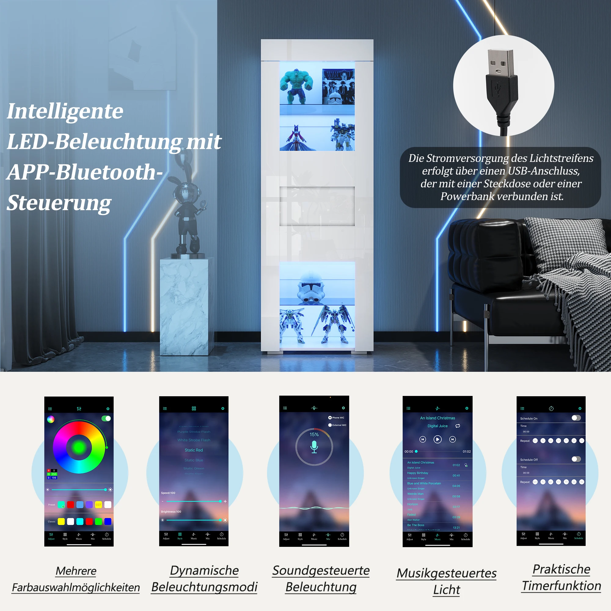 Ambience: The color and brightness of the LED light strip can be continuously adjusted via a mobile app. This creates a lively atmosphere for gatherings and a warm, vibrant lighting effect in everyday life, giving your living room a vibrant ambiance.