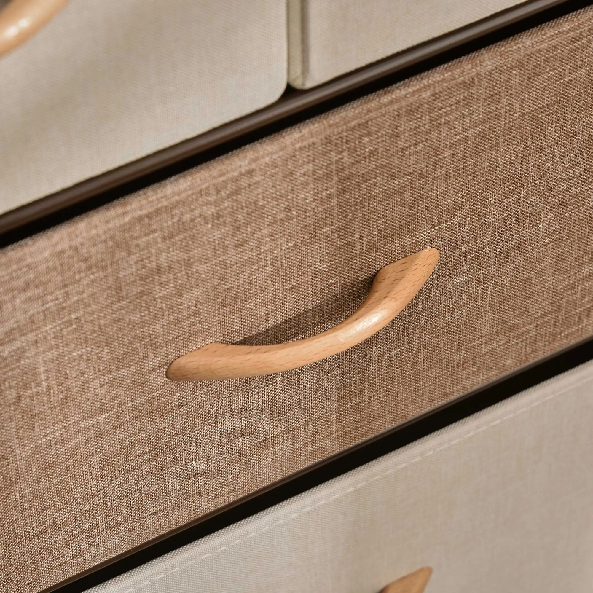 2. Foldable drawers: The 5 foldable drawers made of breathable fabric are easy to clean and can be stored away to save space when not in use. The practical handles on the living room chest of drawers allow for easy sliding out of the drawers.