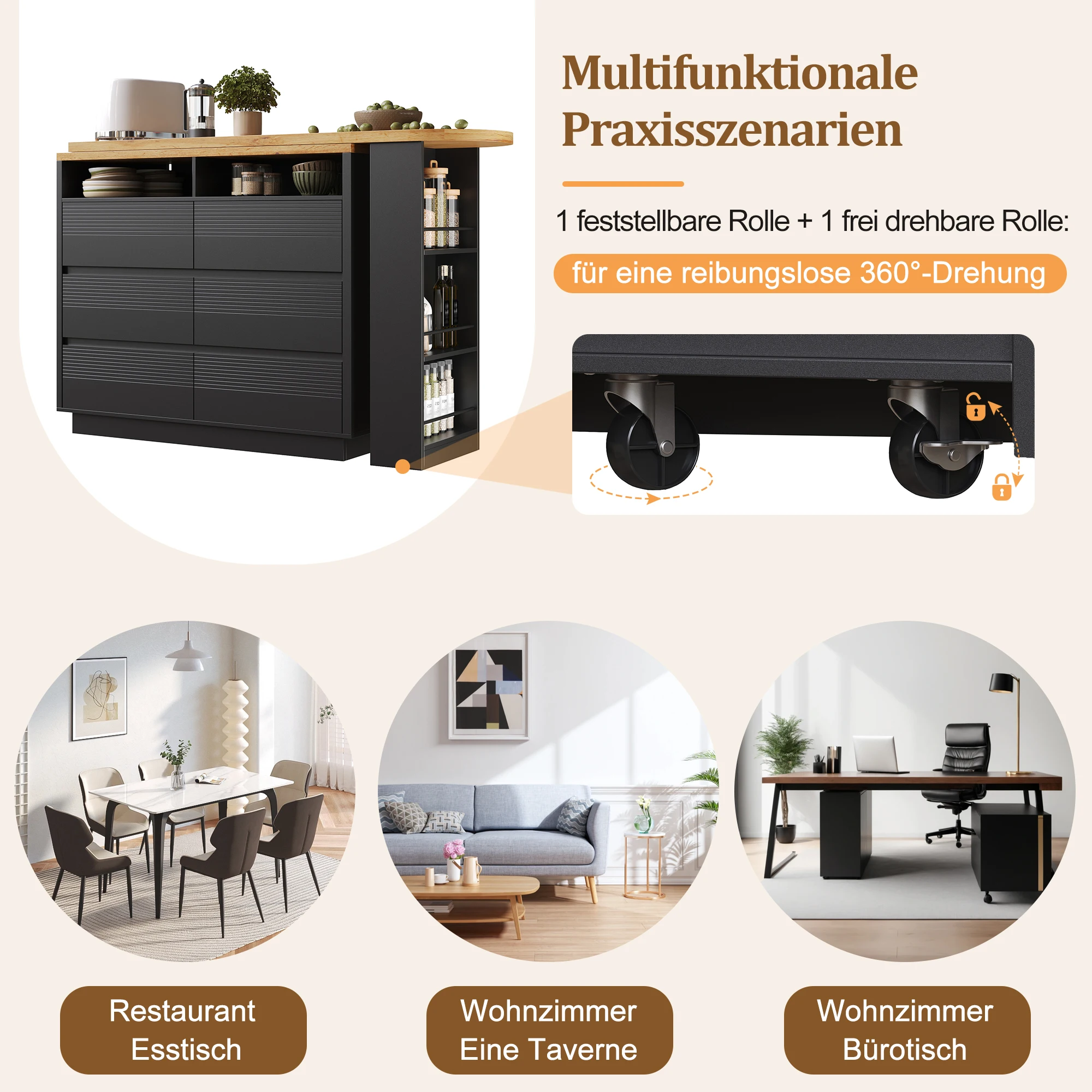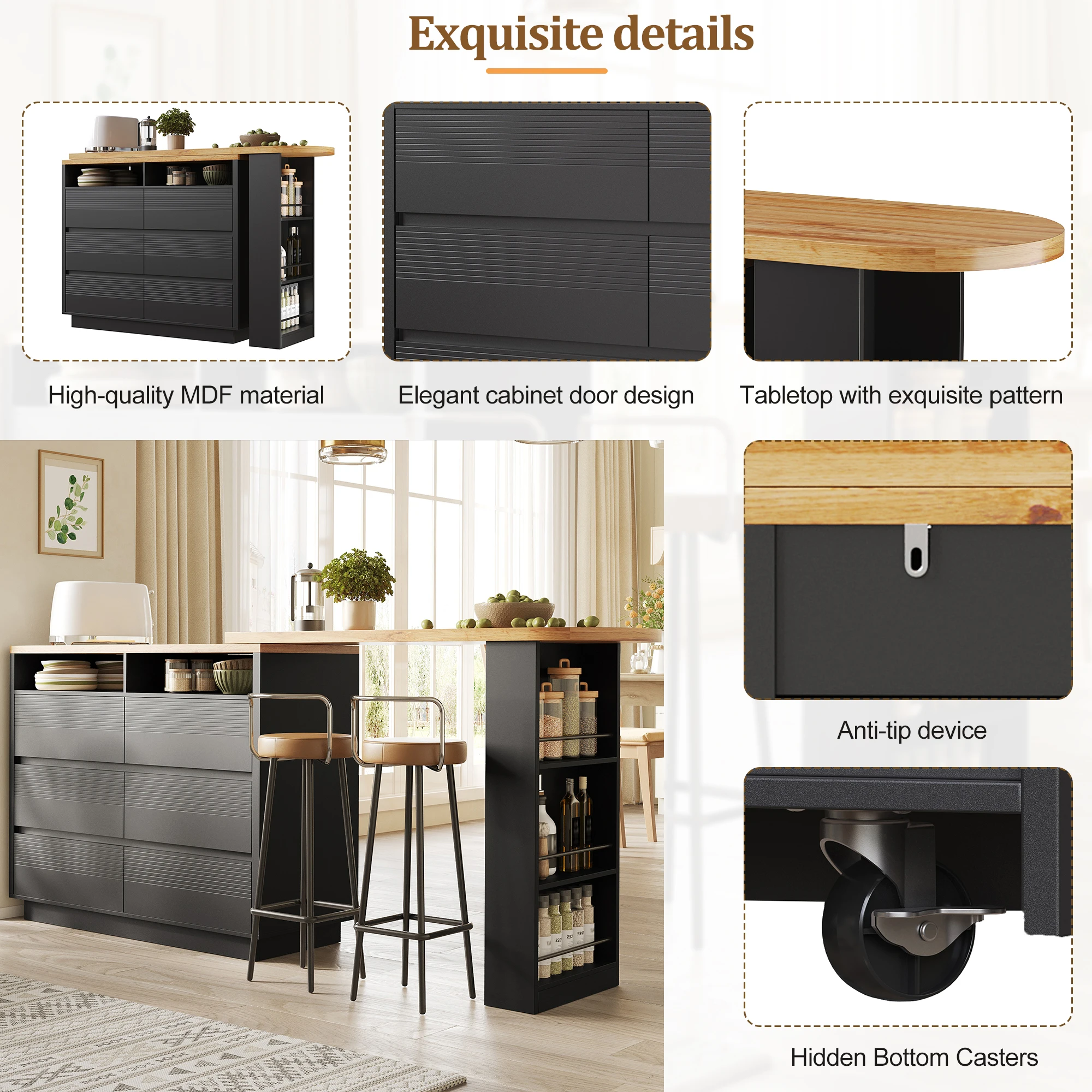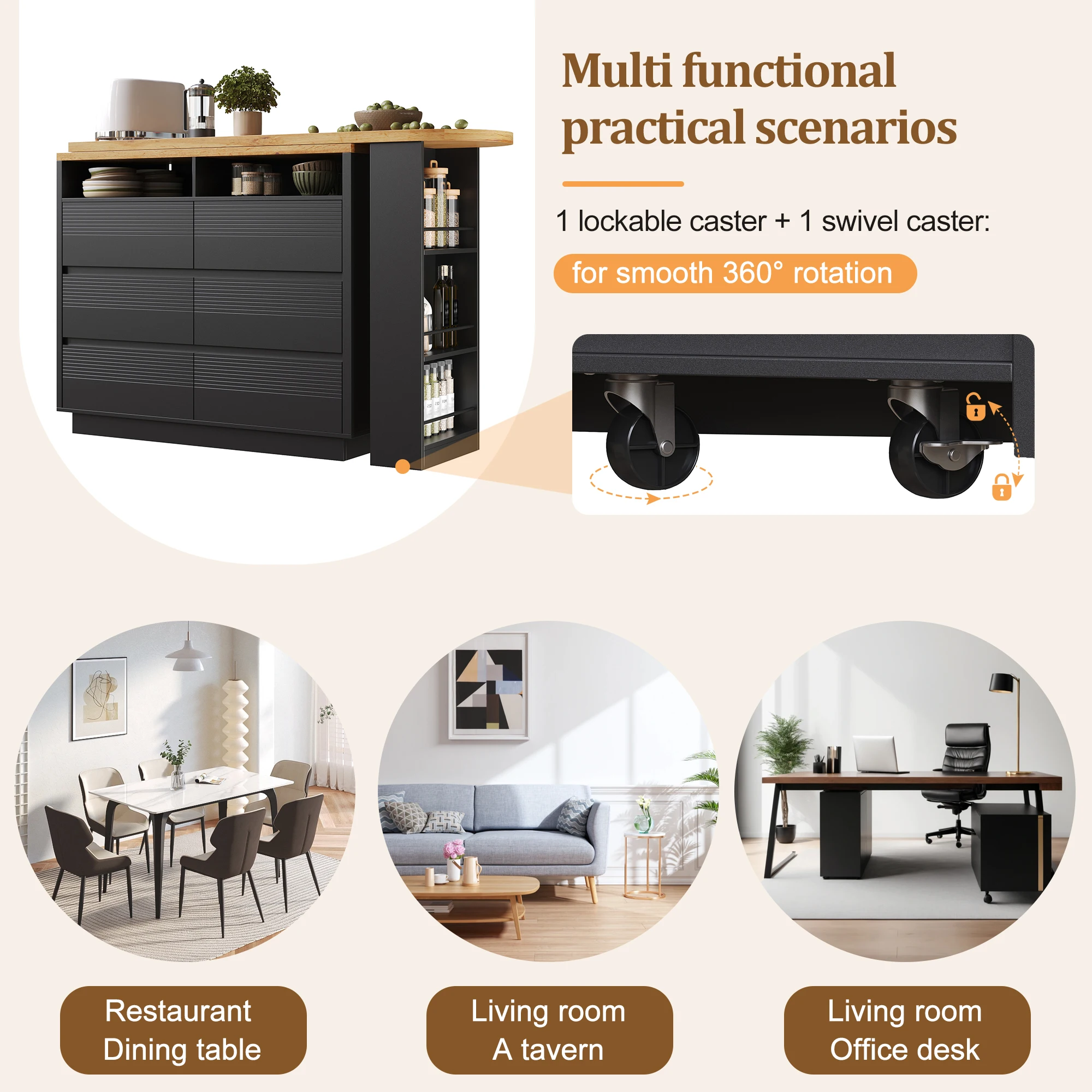 4. Versatile use in various settings: In the living room, it serves as a stylish bar counter; in the dining area, it becomes the perfect dining table; and for working from home, it transforms into a mobile desk. The lockable casters ensure smooth rotation and stability, meeting all your spatial flexibility needs.