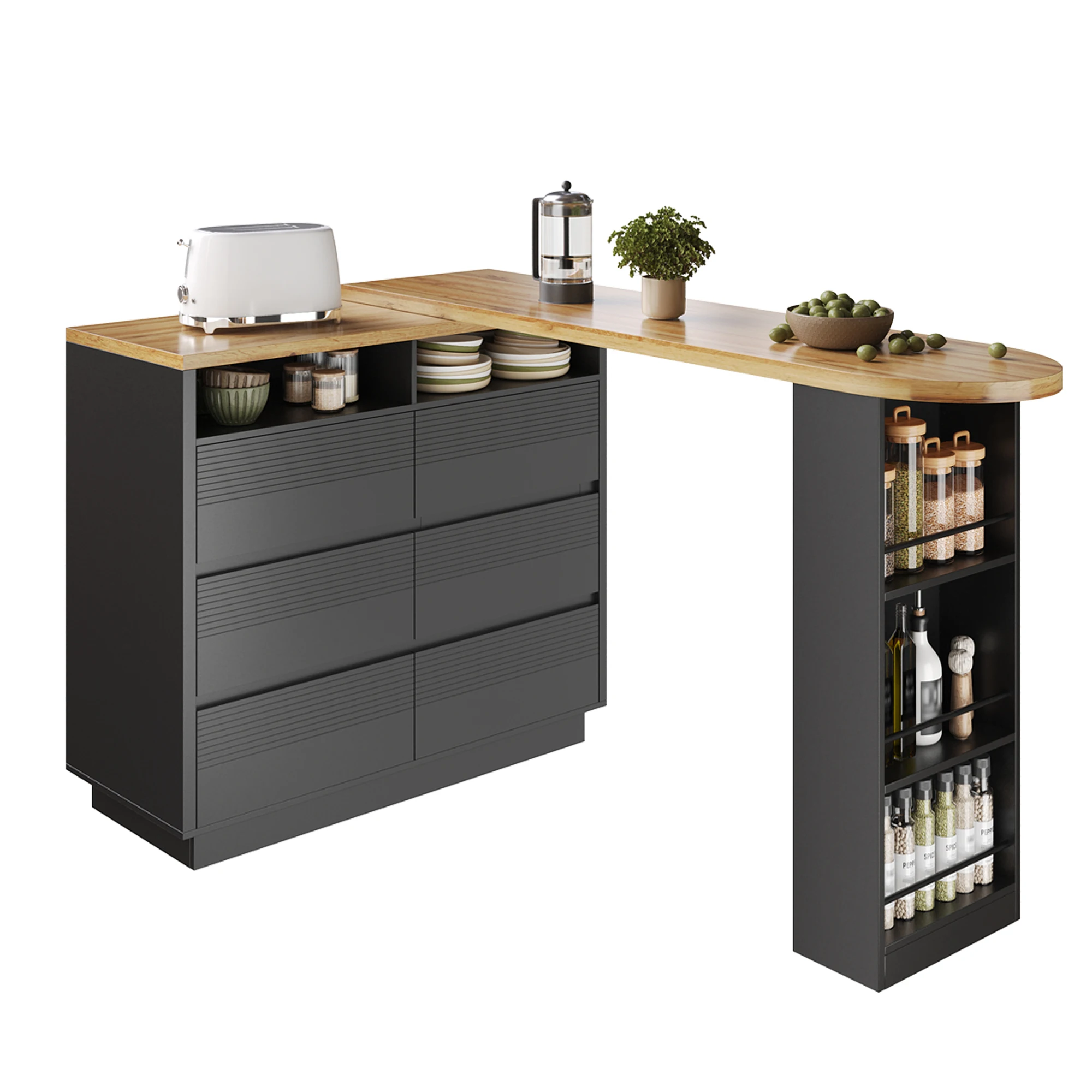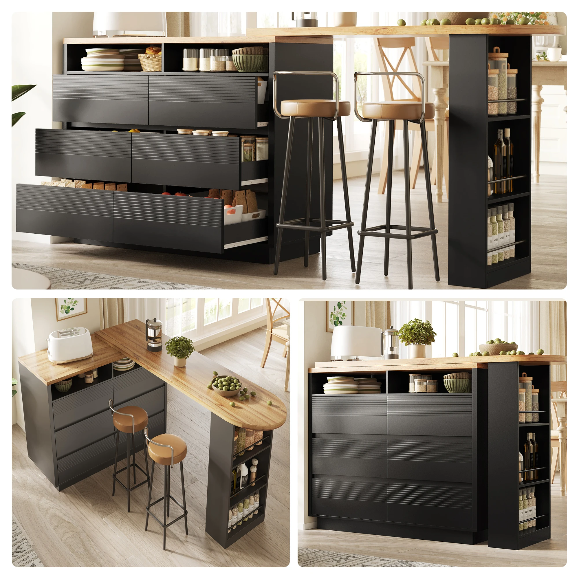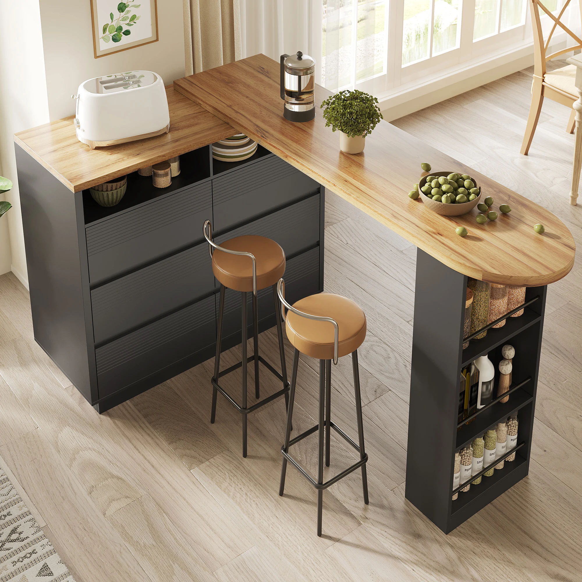 4. Versatile use in various settings: In the living room, it serves as a stylish bar counter; in the dining area, it becomes the perfect dining table; and for working from home, it transforms into a mobile desk. The lockable casters ensure smooth rotation and stability, meeting all your spatial flexibility needs.