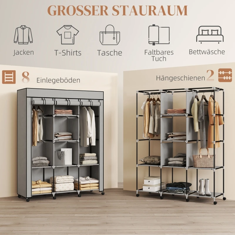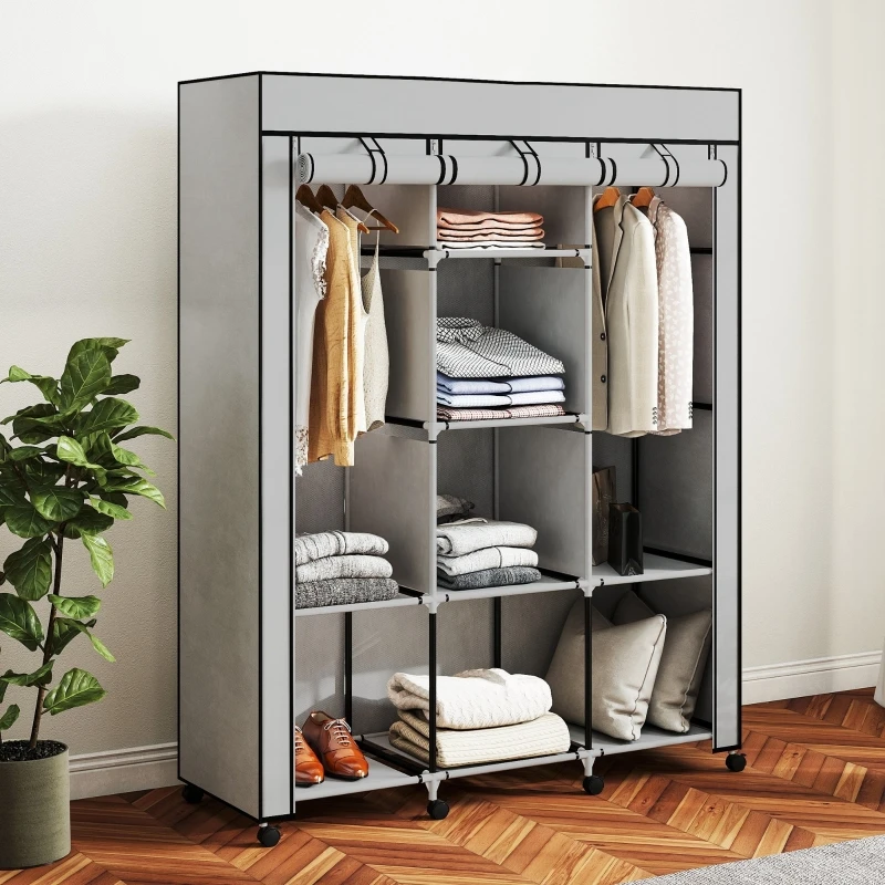 1. Say goodbye to clutter: This fabric wardrobe is perfect for organizing your clothes and other belongings. It features two hanging rails for coats or dresses and eight shelves to keep your clothes, towels, and linens neatly folded and organized.