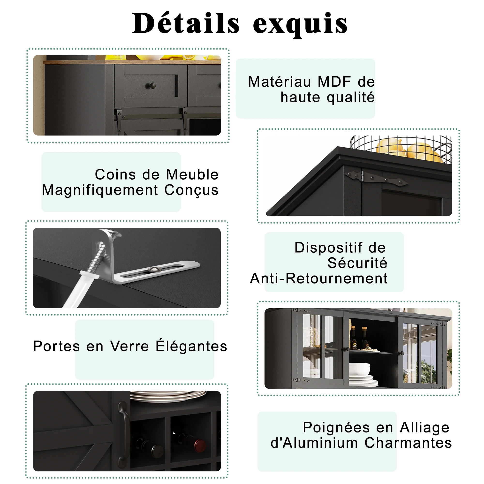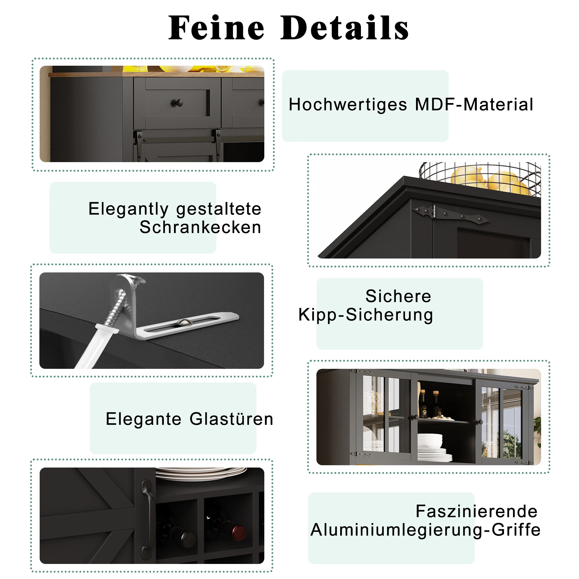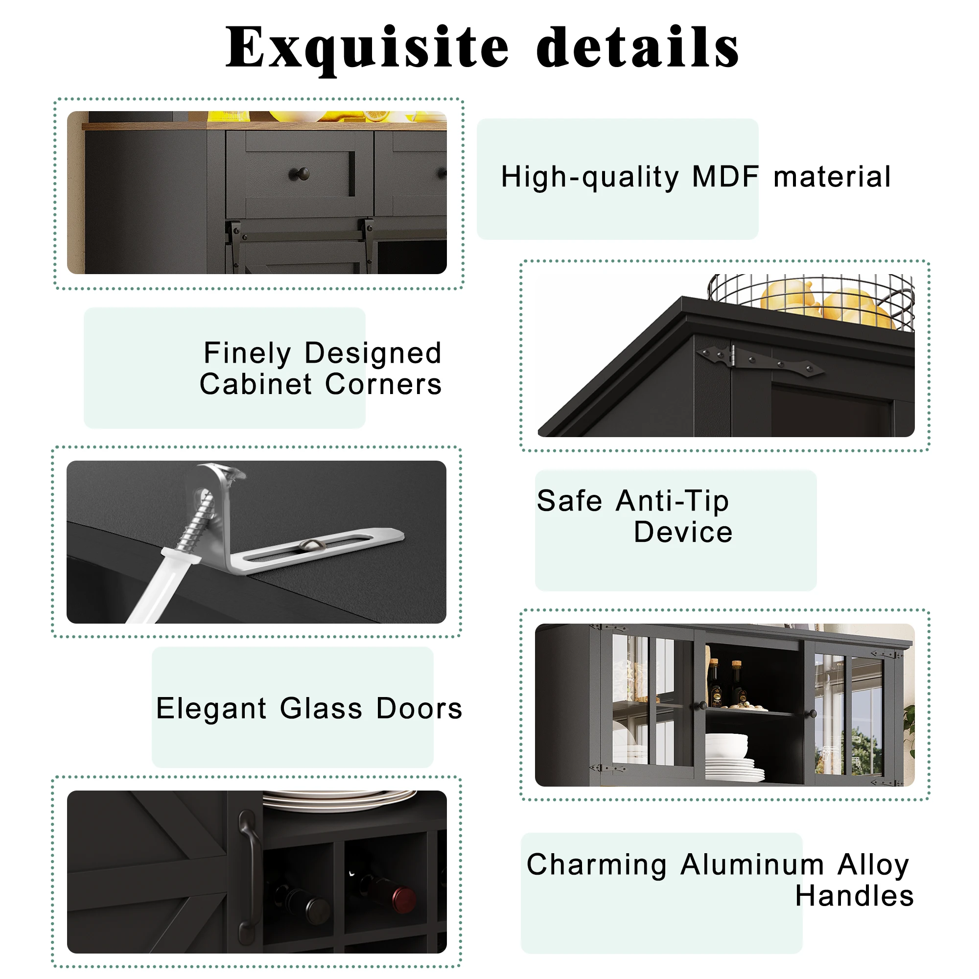 1. Exquisite Design & High-Quality Material: Made of high-density MDF board, with elegant glass doors and aluminum handles, crafted with precise details for a modern living space.