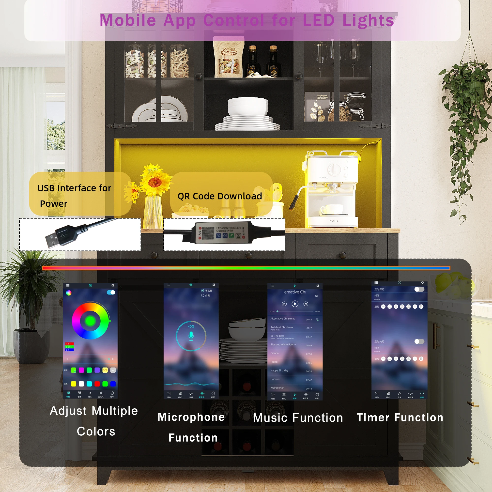 2. Multifunctional LED Light Control: Supports smartphone app control, offering a variety of colors. Scan and download the app to read local music files, controlling the lights according to the volume and rhythm of the syllables and the music's tempo.