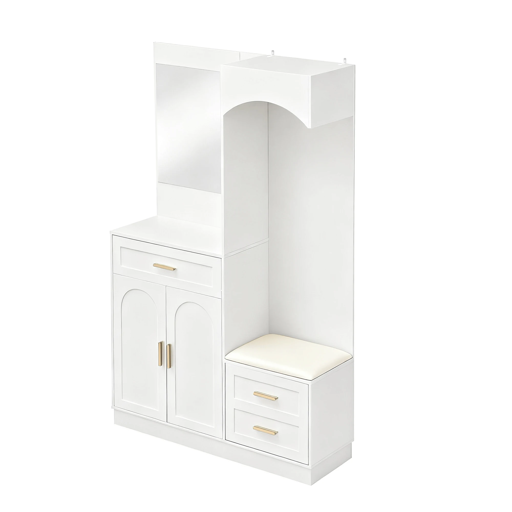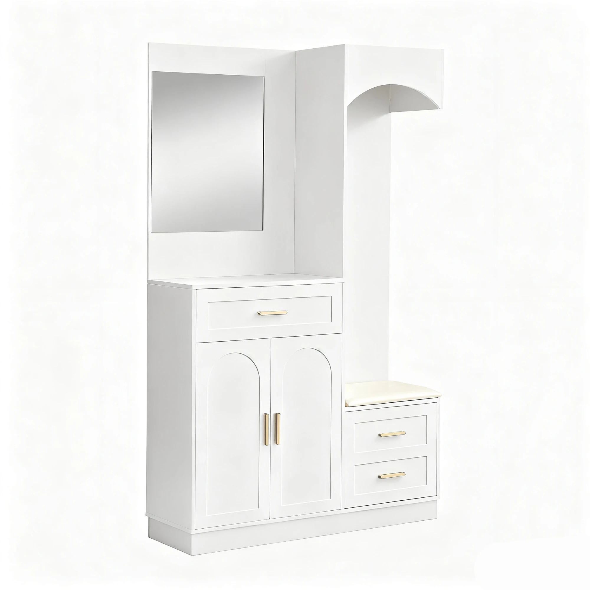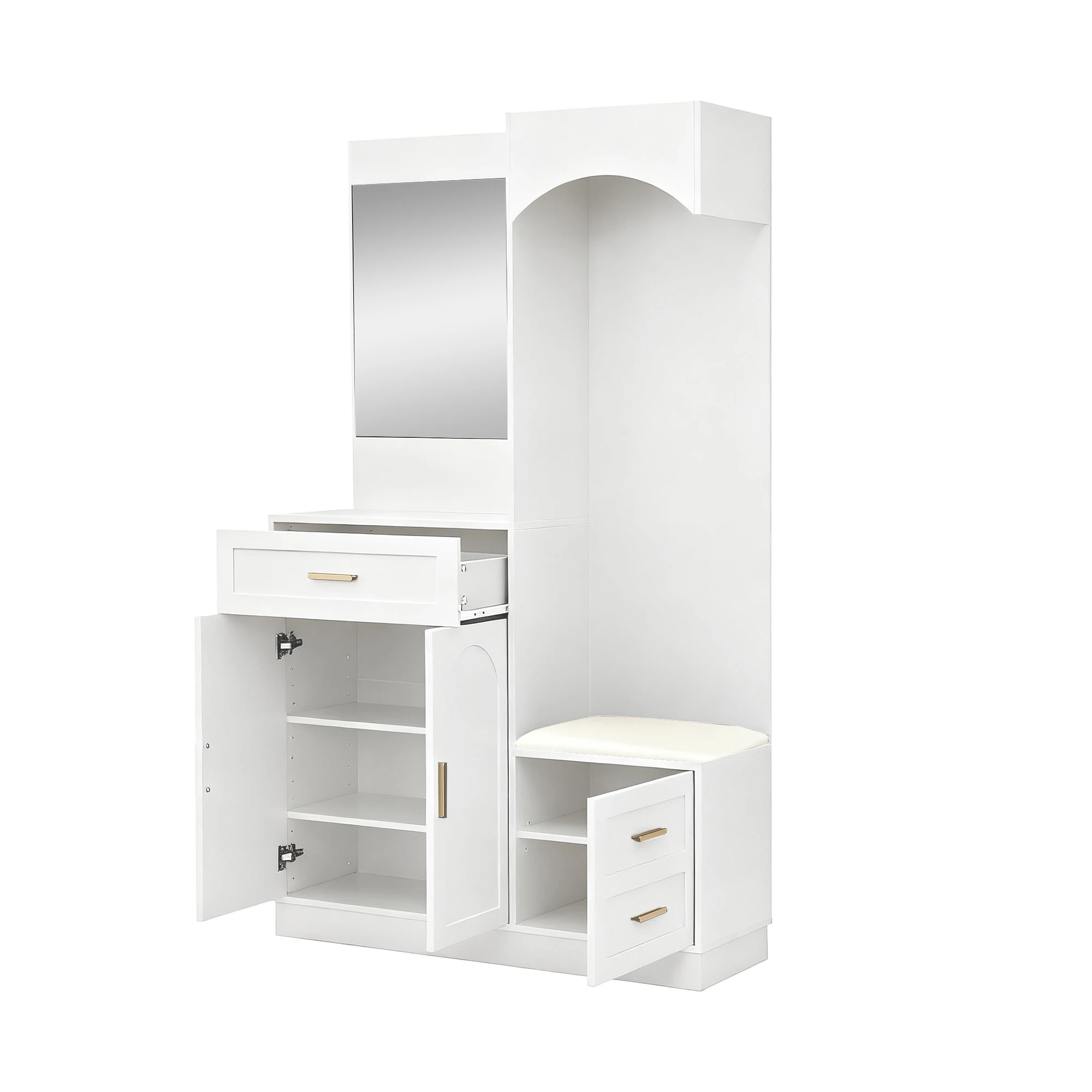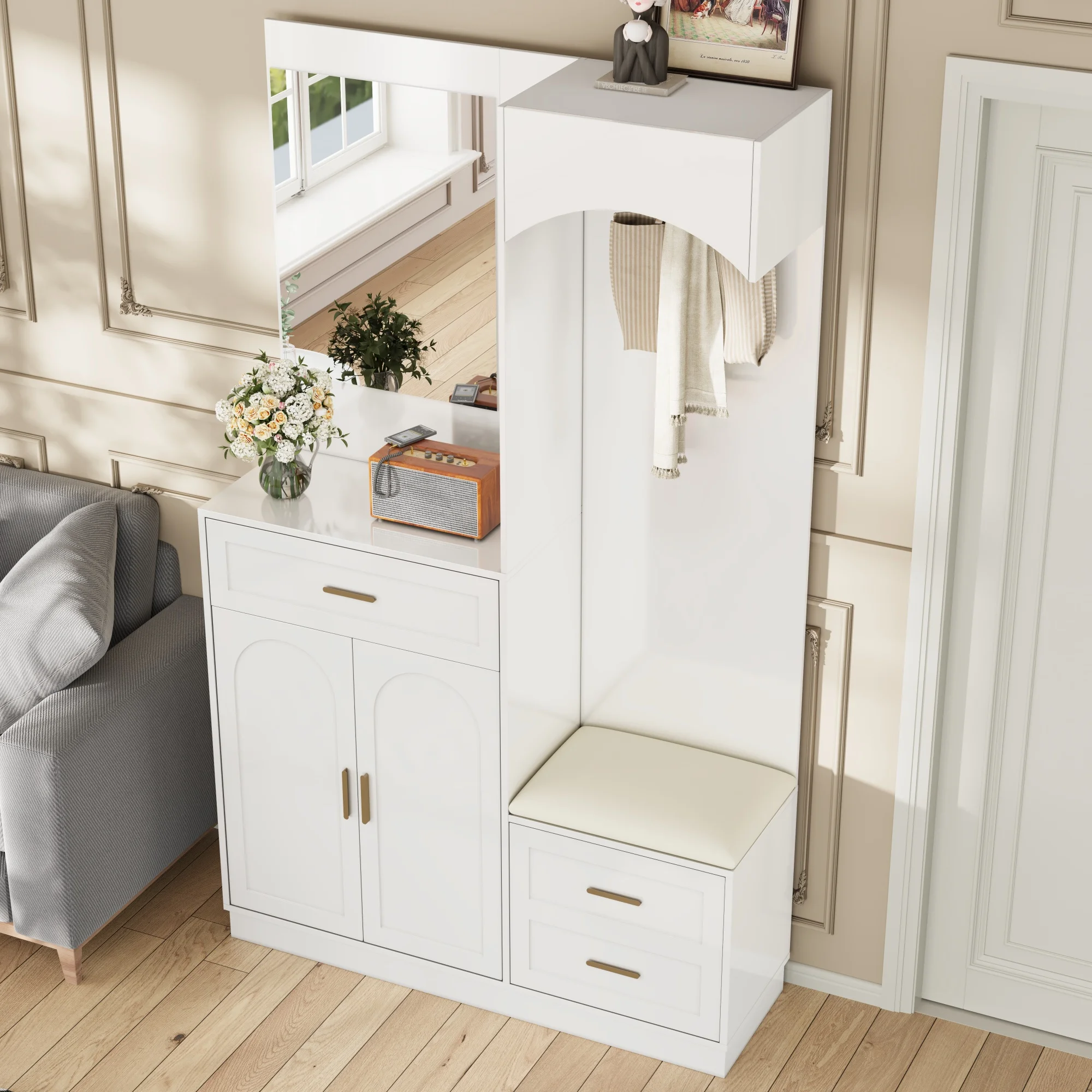 2. Versatile Storage: This piece of furniture combines a coat rack, shoe cabinet, vanity mirror, and shoe bench in one, offering ample storage space and comfortable seating for a variety of storage and usage needs.