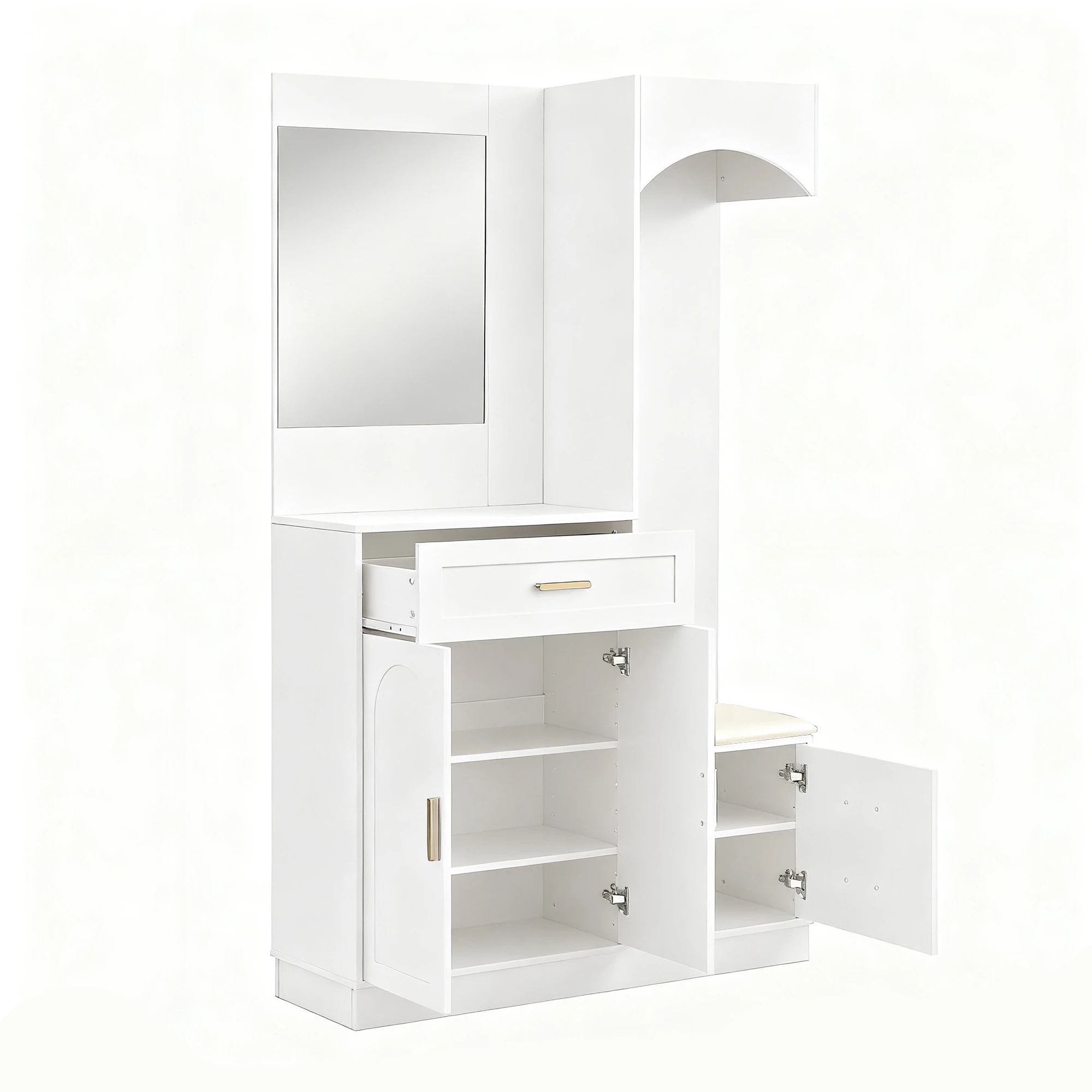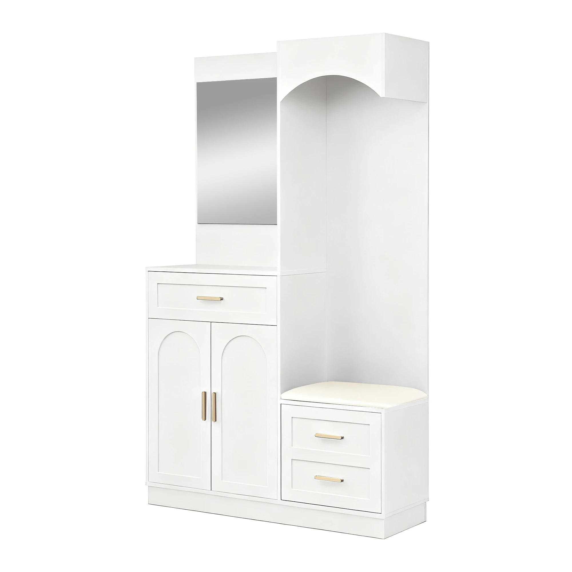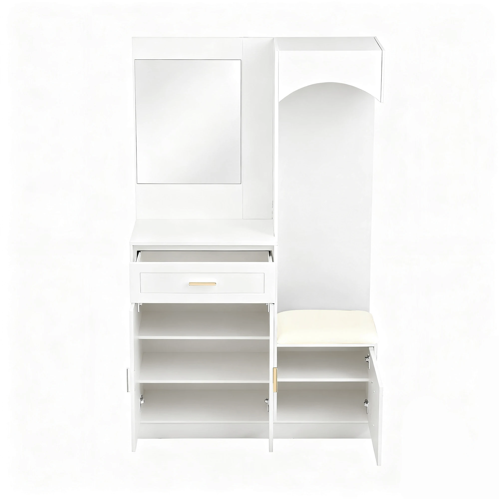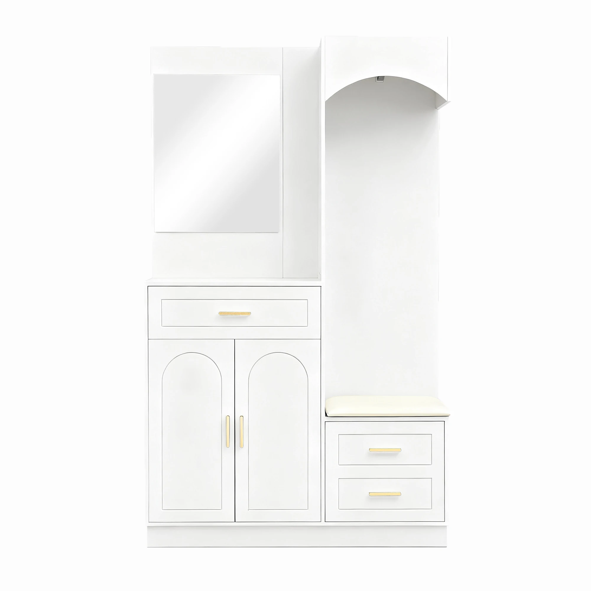 2. Versatile Storage: This piece of furniture combines a coat rack, shoe cabinet, vanity mirror, and shoe bench in one, offering ample storage space and comfortable seating for a variety of storage and usage needs.