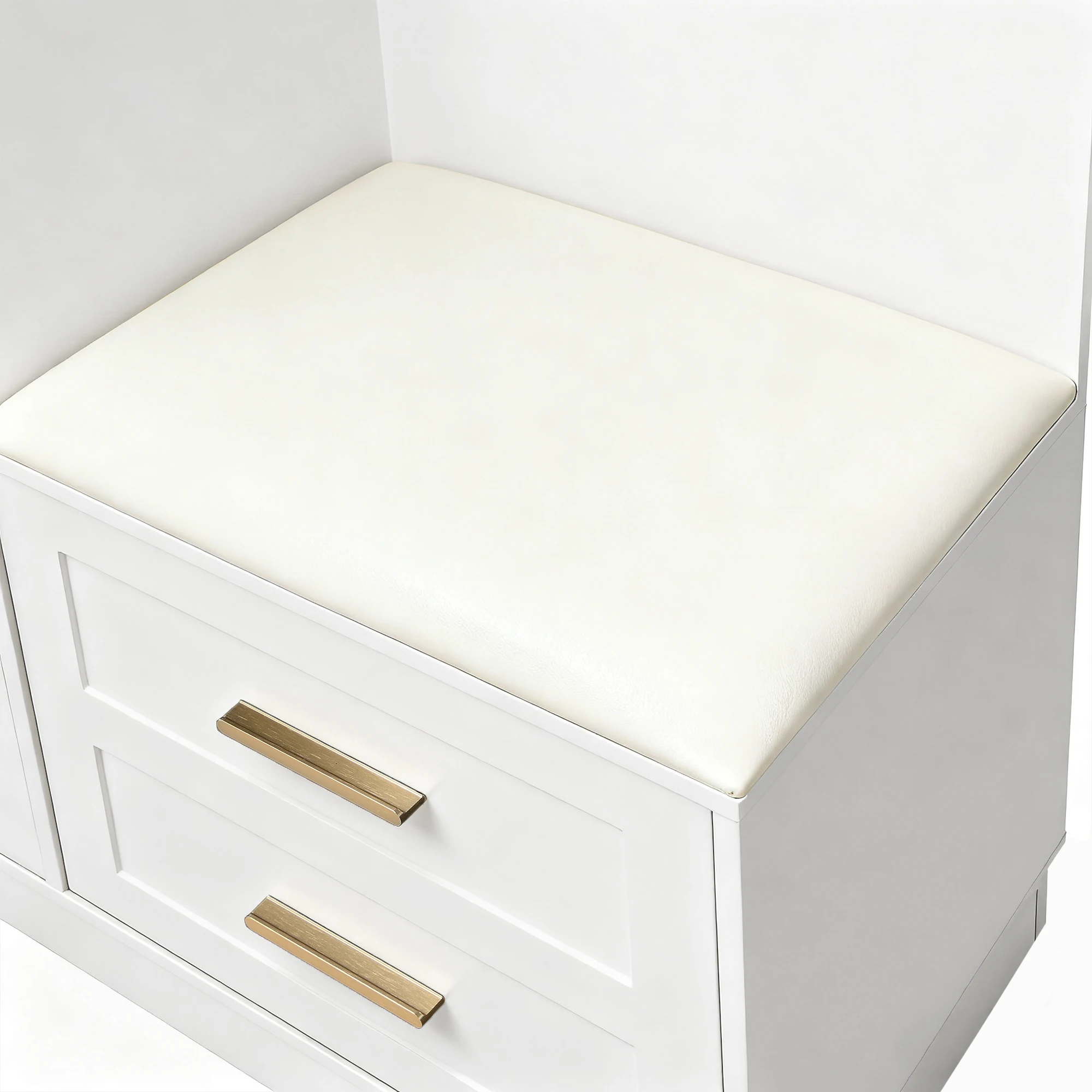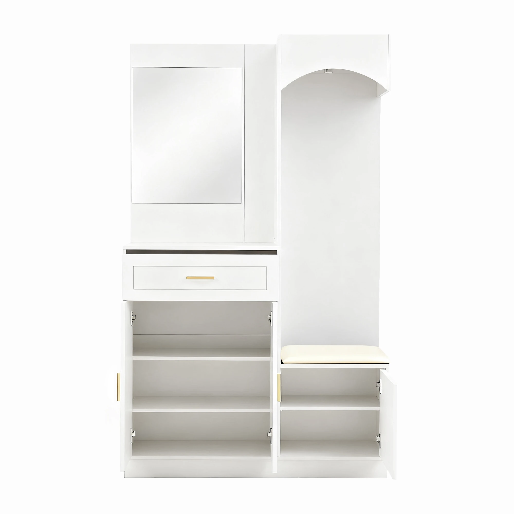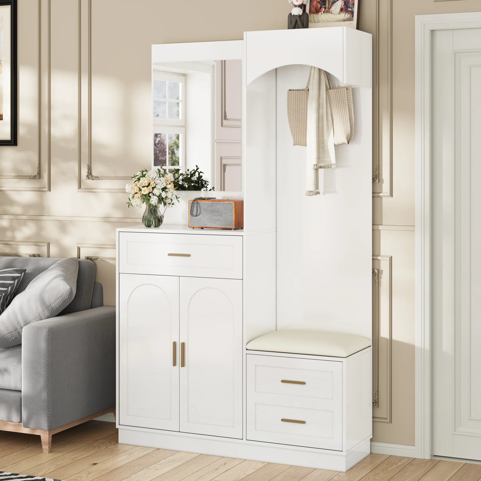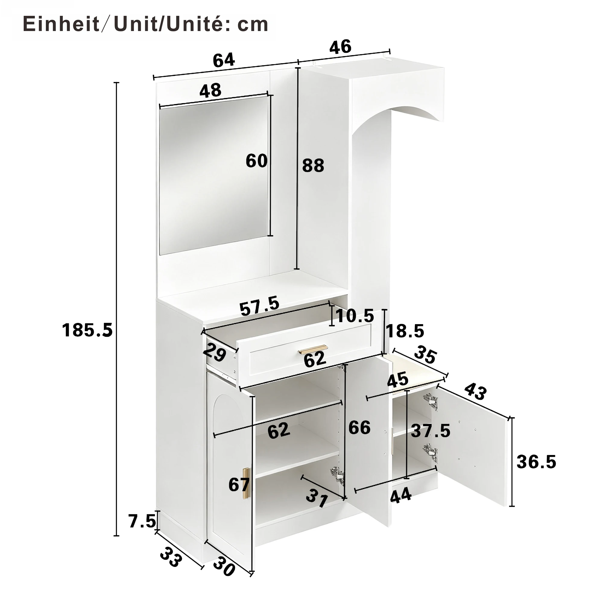 2. Versatile Storage: This piece of furniture combines a coat rack, shoe cabinet, vanity mirror, and shoe bench in one, offering ample storage space and comfortable seating for a variety of storage and usage needs.