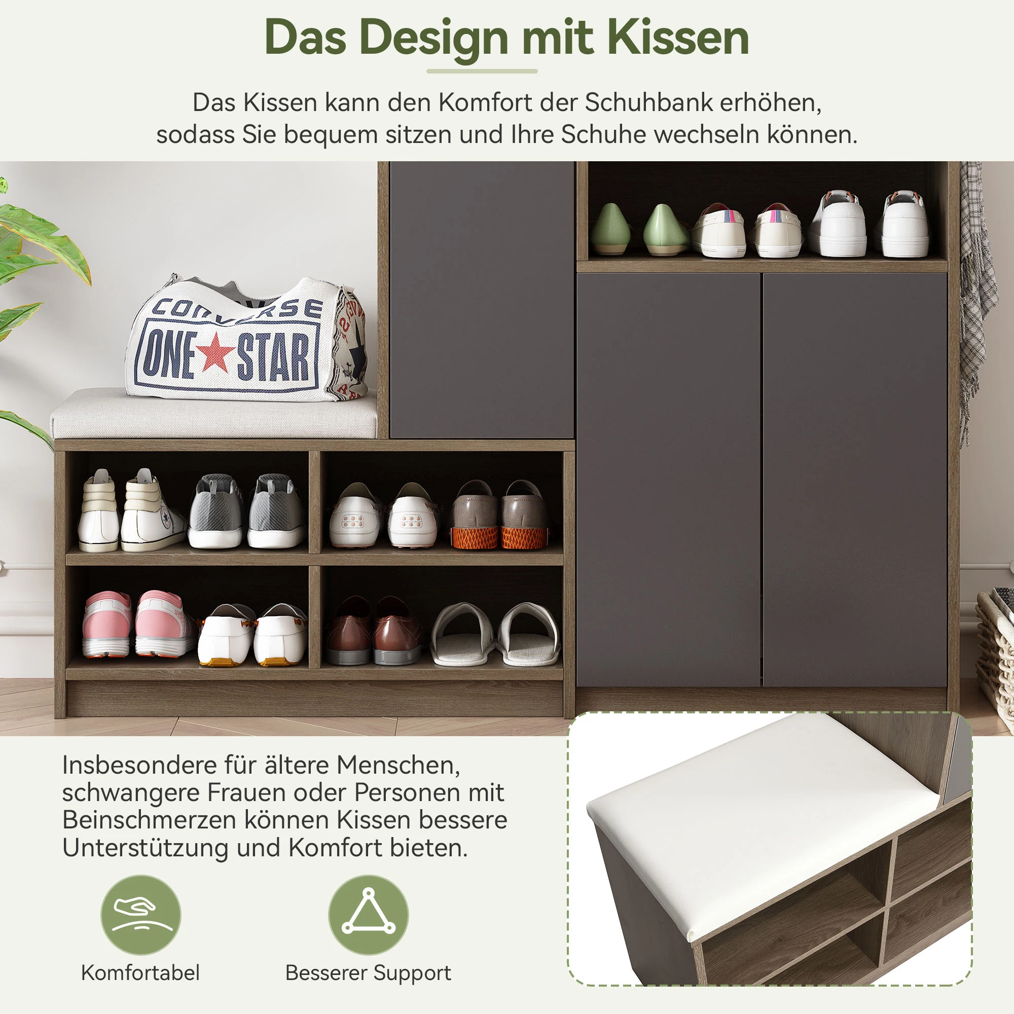 The cushion enhances the comfort of the shoe rack bench, allowing you to sit comfortably while changing your shoes.