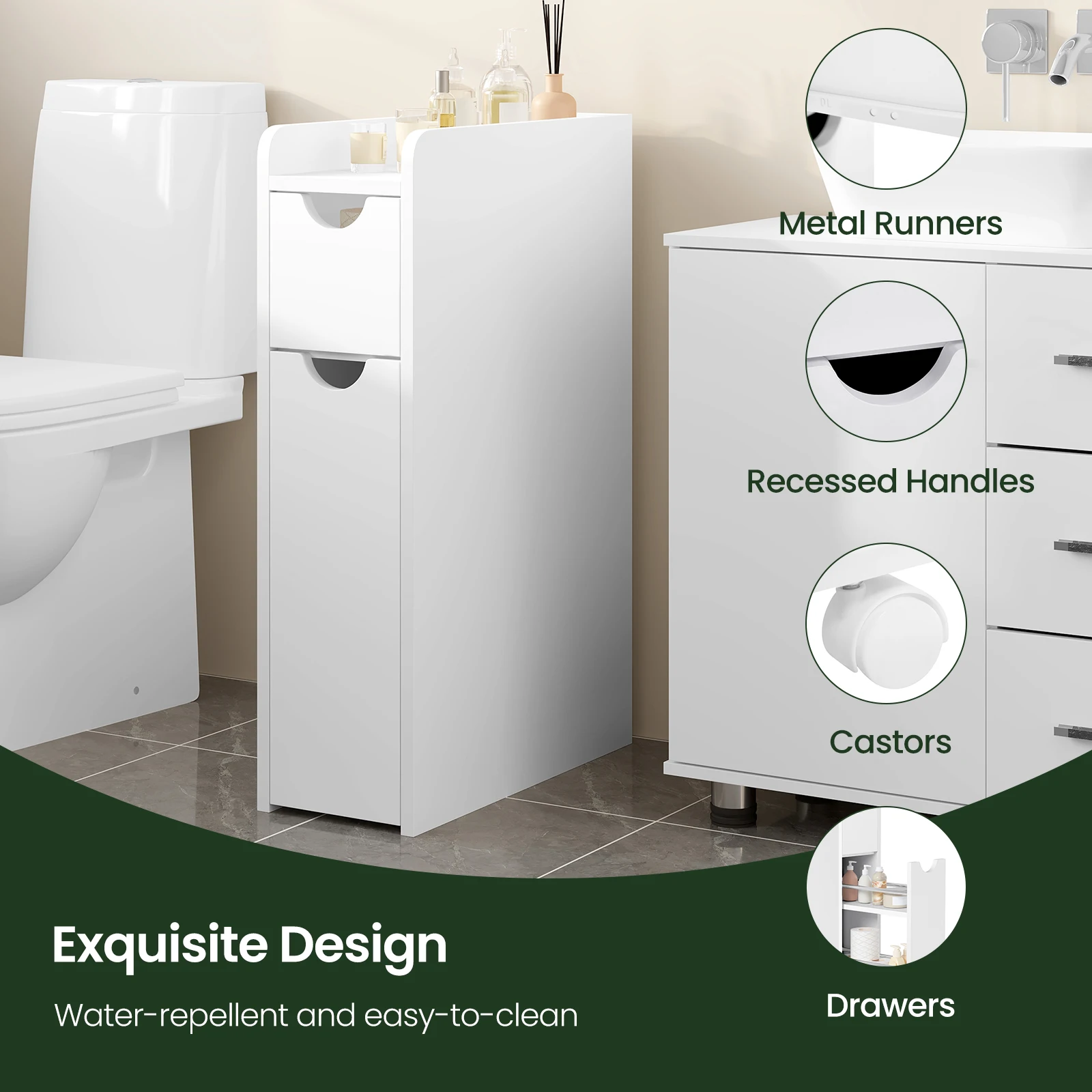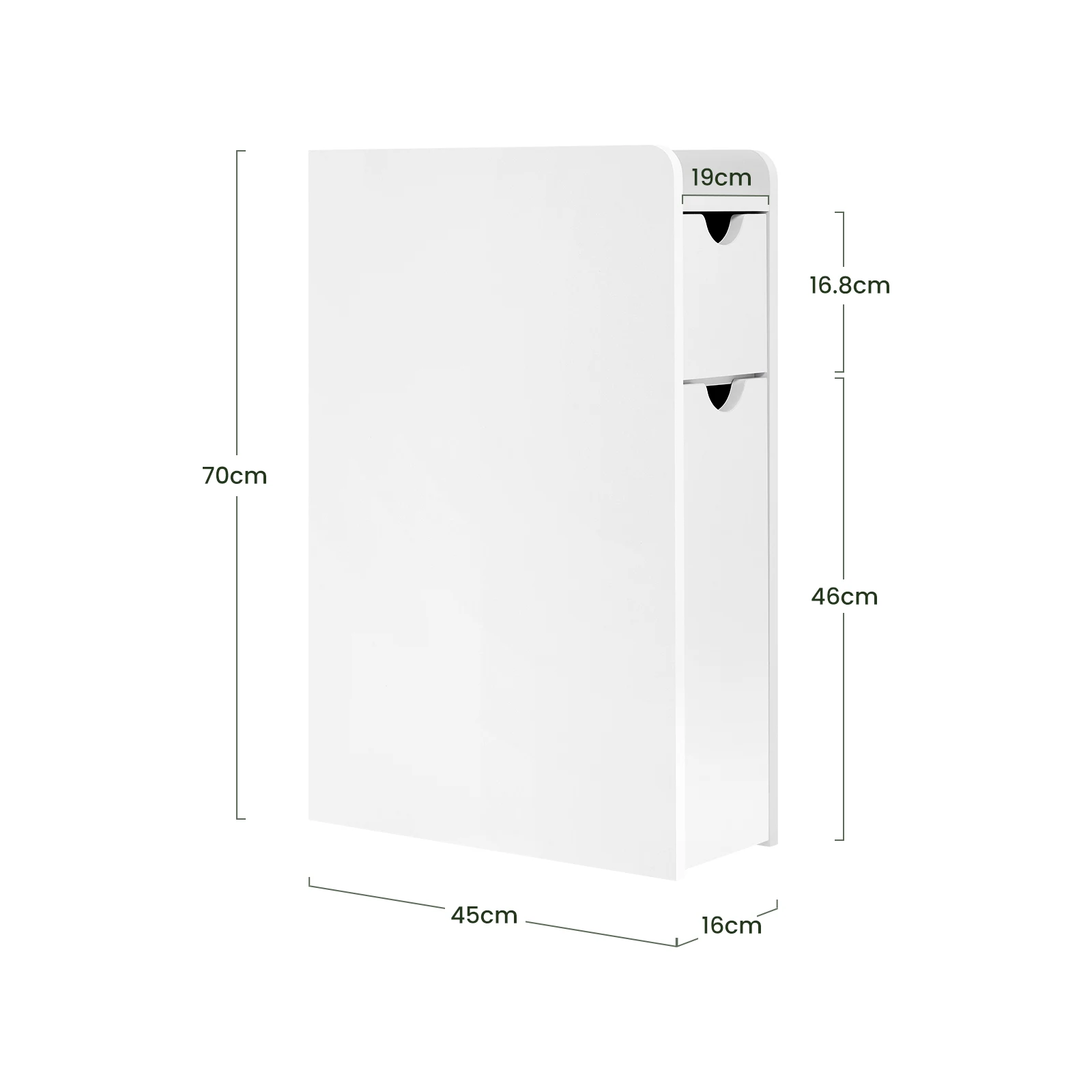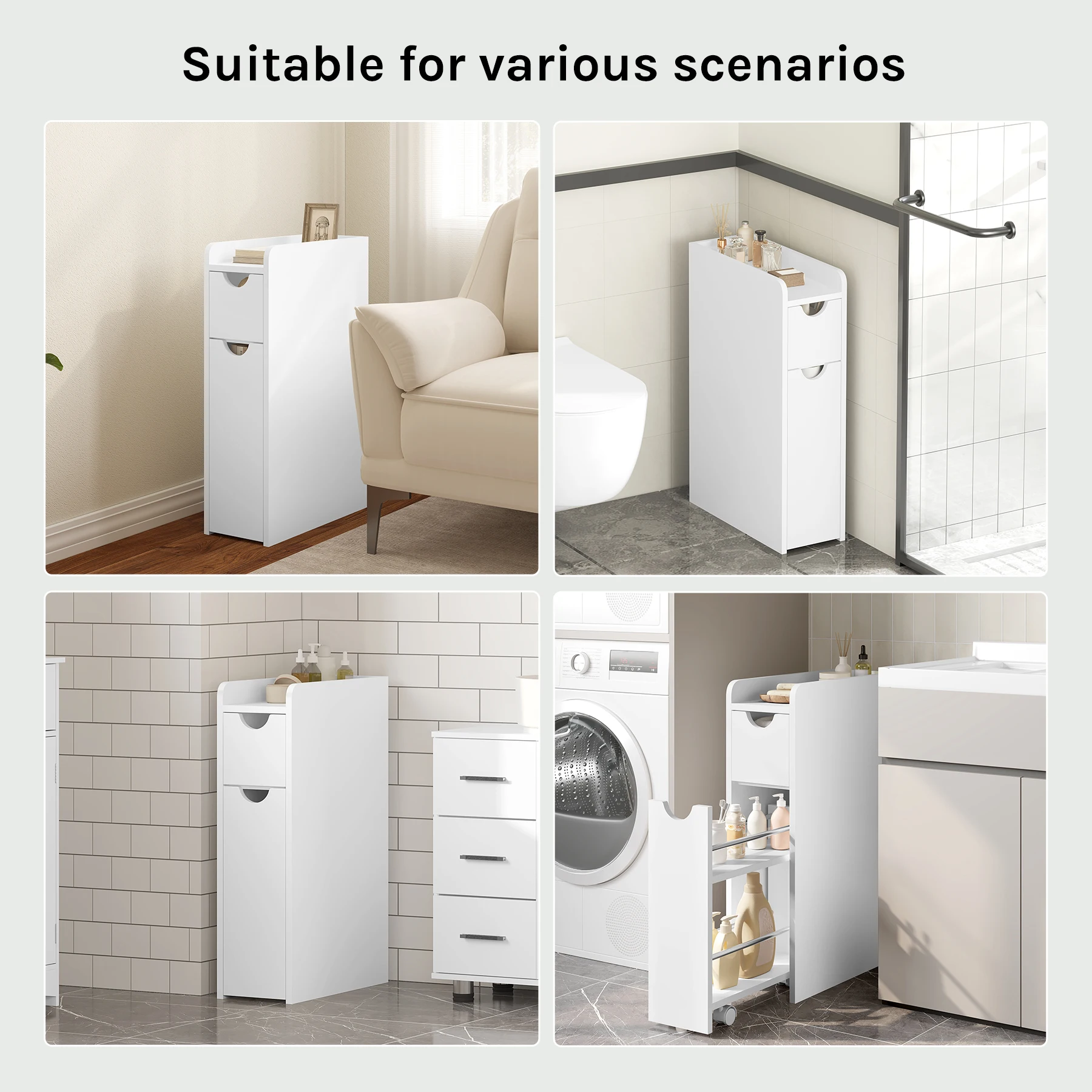 White Narrow Bathroom Cabinet with Wheels Space-Saving Storage for Small Spaces 2 Roll-Out Drawers & Anti-Tip Design 19x45x70cm