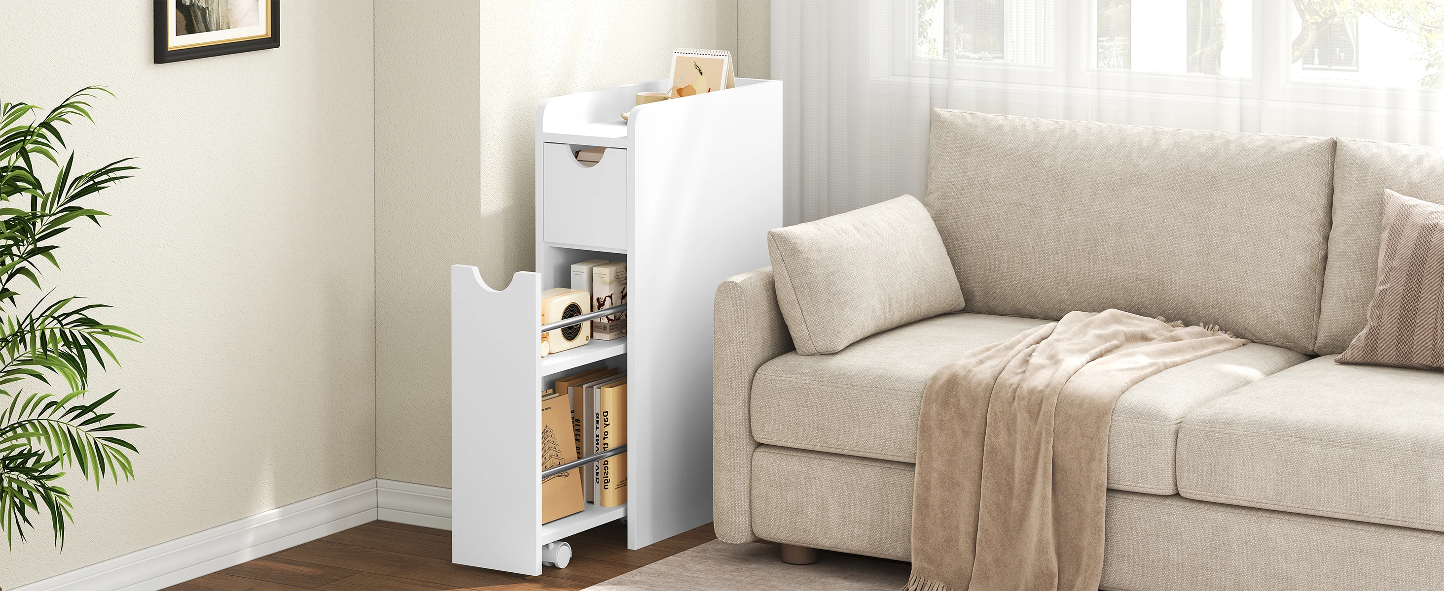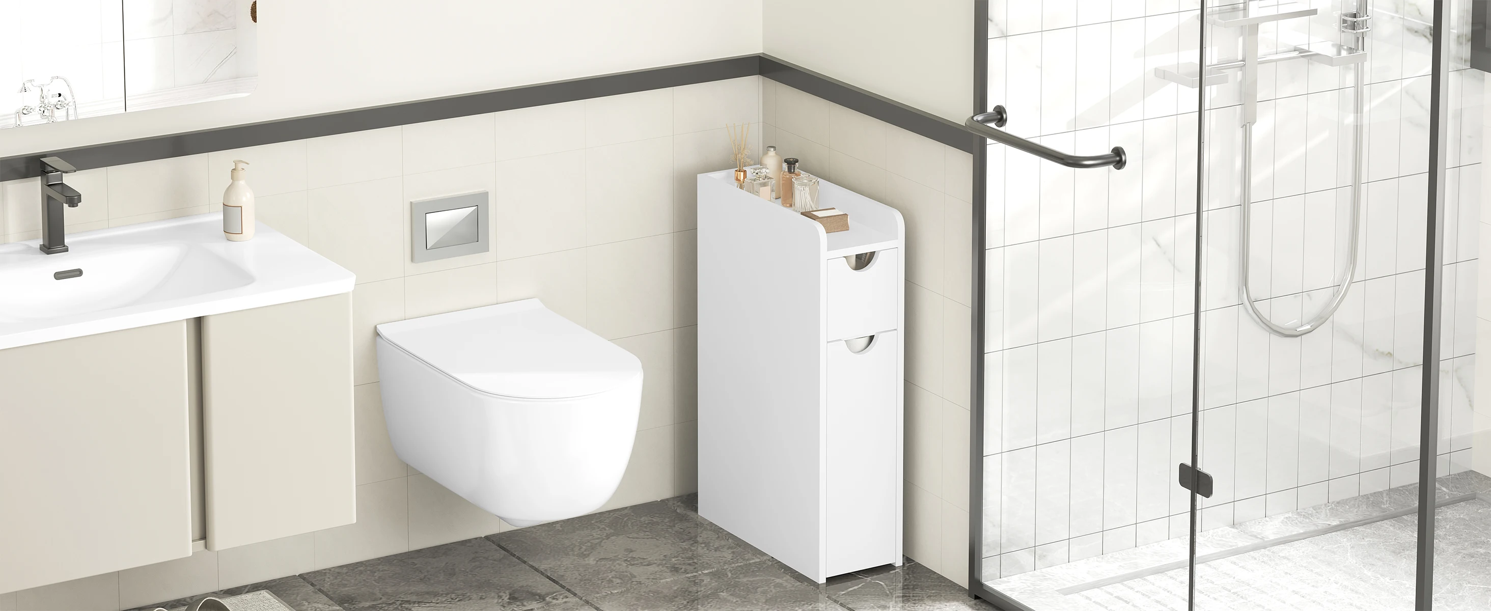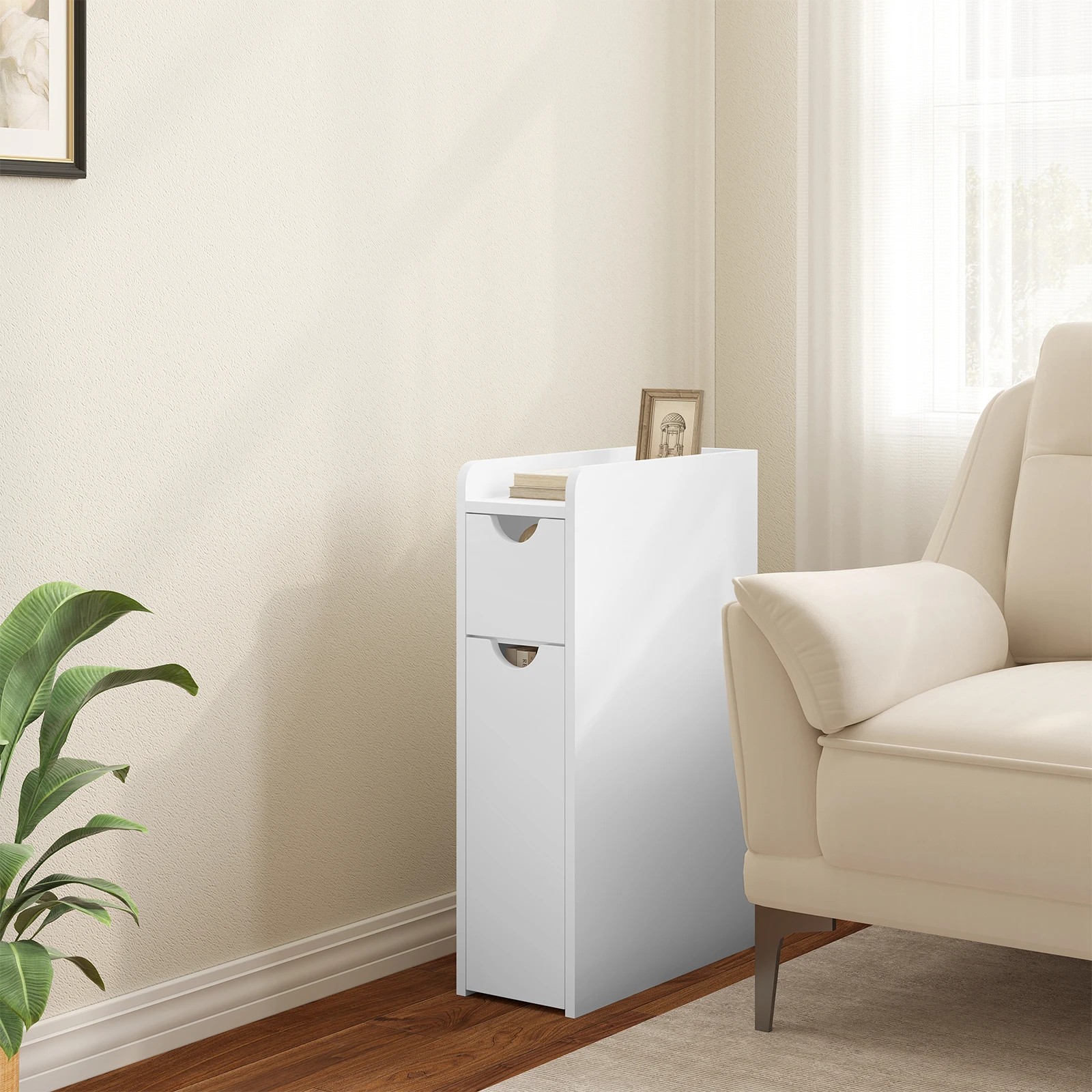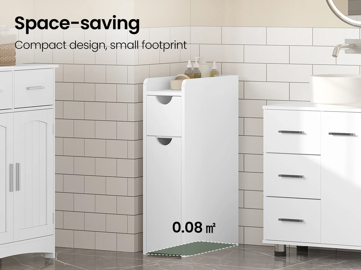 White Narrow Bathroom Cabinet with Wheels Space-Saving Storage for Small Spaces 2 Roll-Out Drawers & Anti-Tip Design 19x45x70cm