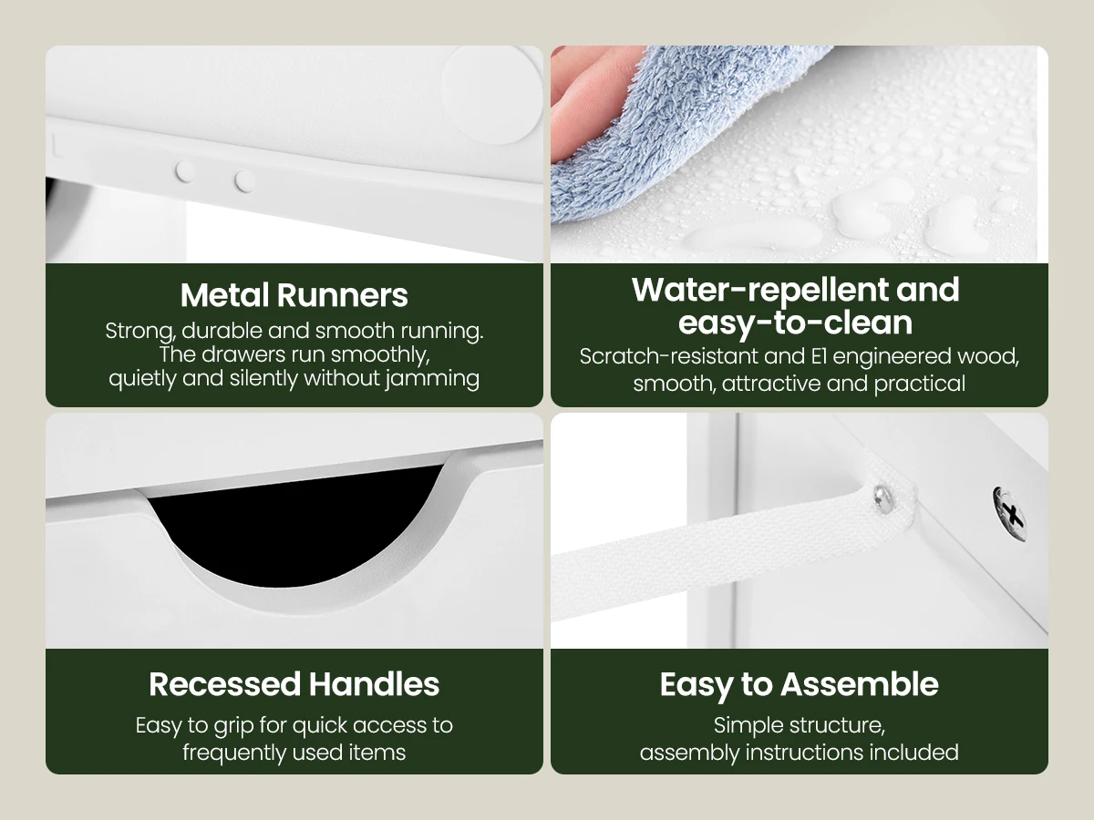 DRAWERS WITH WHEELS: The lower drawers of the bathroom cabinet are equipped with casters that allow easy pull out and easy access to the items you want. The mounting plate on the bottom prevents the bottom drawer from falling out