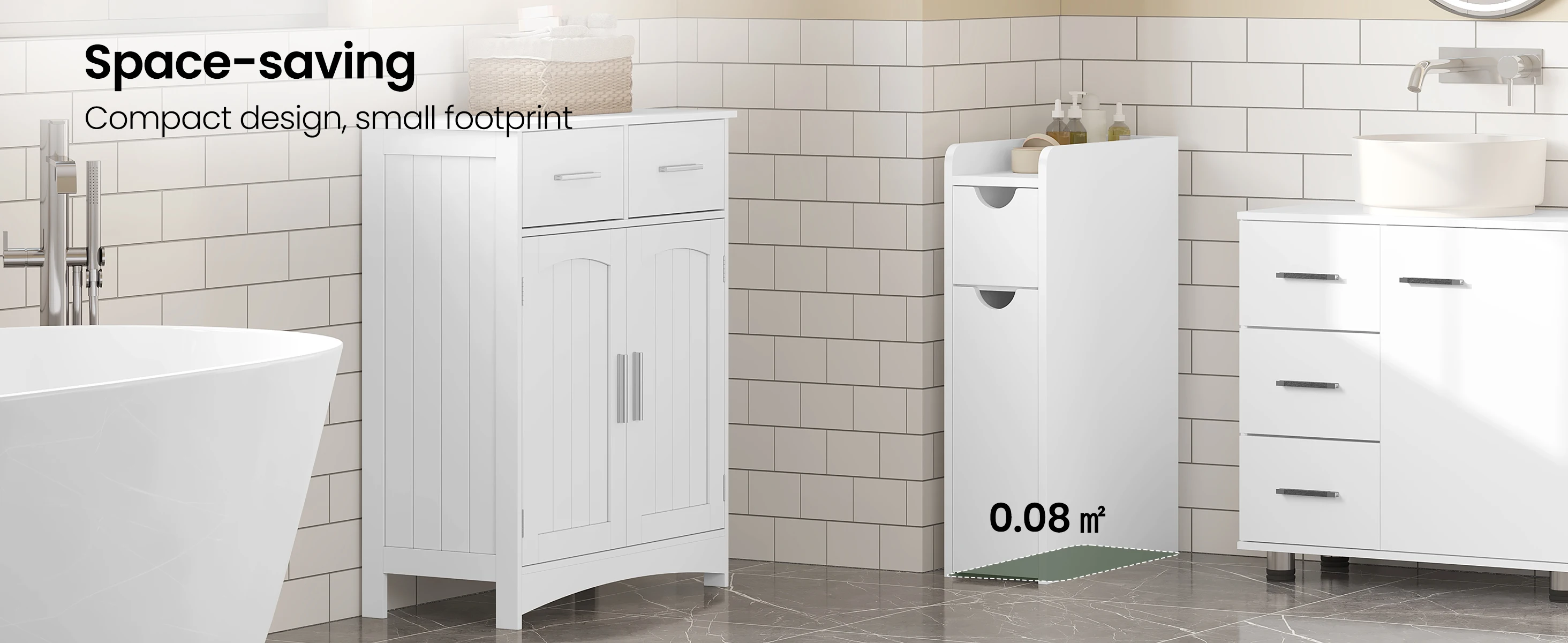 Plenty of storage space: 2 drawers for sorting and storage, the top drawer is suitable for storing cosmetics and small items, while the bottom drawer can hold large detergent bottles and other daily necessities; The top of the bathroom cabinet is specially designed with a 2 inch high pull-out on which you can put your phone, toothbrush, skincare and other frequently used items
